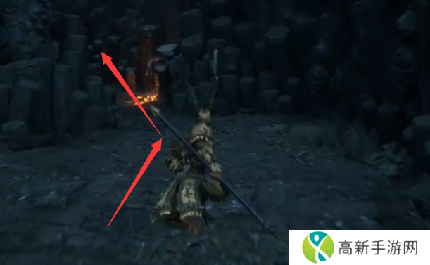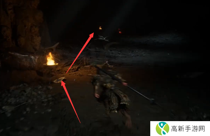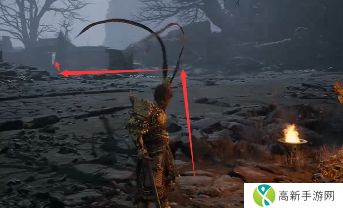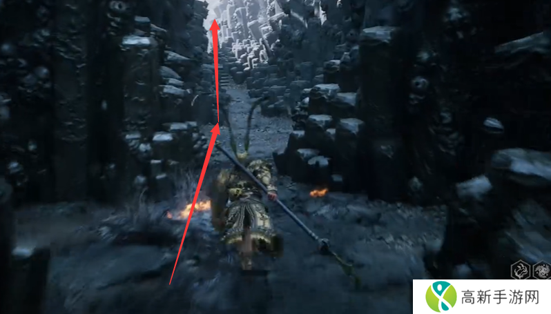 4、继续靠着左侧走,来到前方两个火盆的位置。