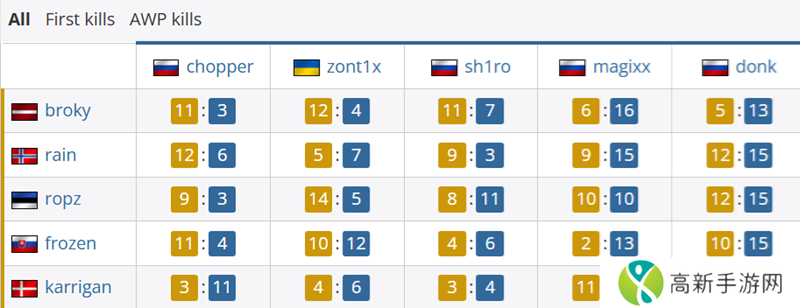 在全部对位数据上,donk全面压制FaZe选手,magixx除了和