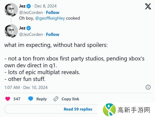 消息来自于业内记者Jez Corden,近日他在X上表示,尽管他期待在本周晚些时候的游戏颁奖典礼上“展示大量史诗般的多平台游戏”,但他认为Xbox不会有太多表现,这是因为该公司计划在2025年的第一季度举办自己的开发者直面会(Developer Direct)。