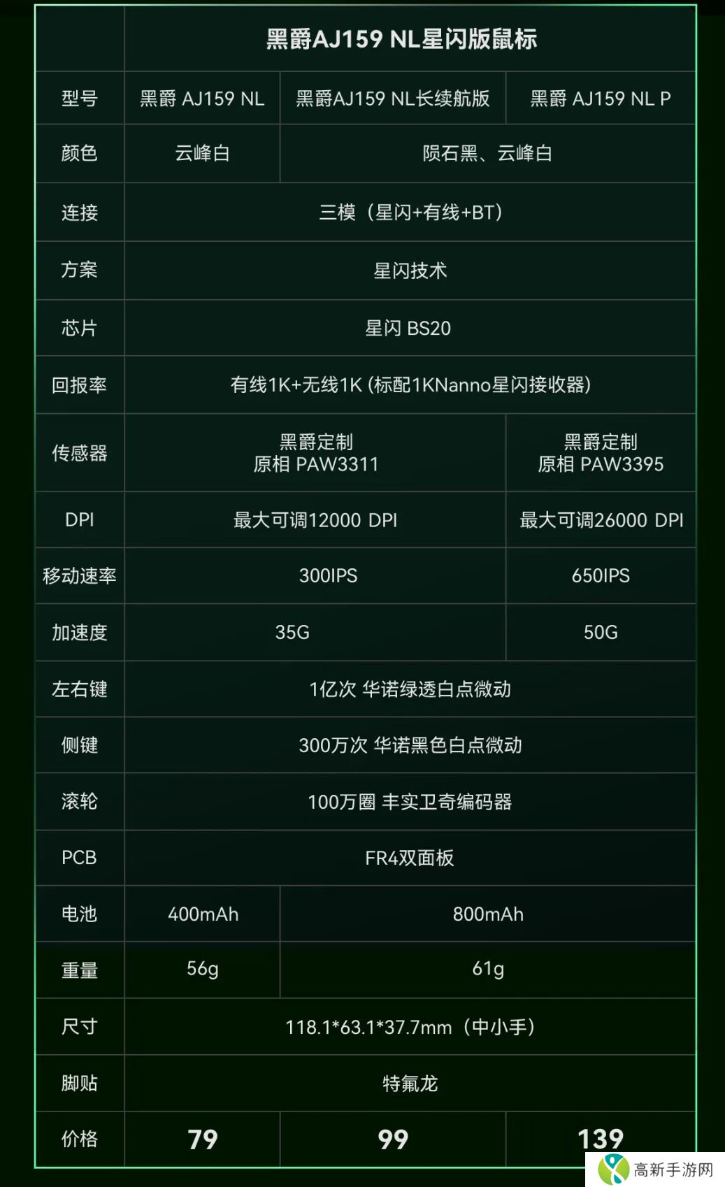 本站附黑爵 AJ159 NL 系列星闪鼠标产品参数对比如下: