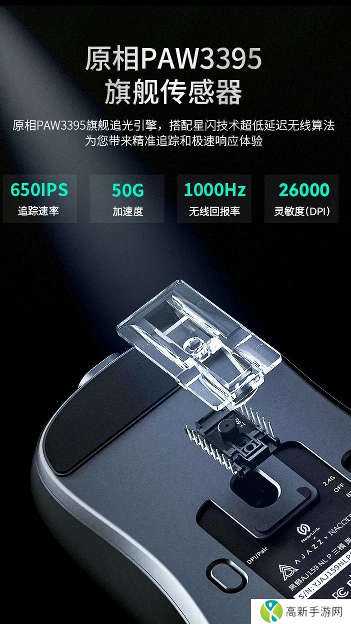 黑爵 AJ159 NL P 高配版鼠标搭载原相 PAW3395 传感器(其他版本为 PAW3311),支持 100-26000DPI 可调、650IPS 追踪速率、50G 加速度。黑爵 AJ159 NL 全系左右按键采用华诺绿透白点微动开关(1 亿次点击寿命)、滚轮为丰实卫奇编码器(100 万圈)。