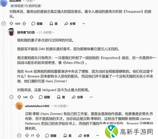 虽然看起来很多人单独欣赏《影障守护者》的配乐,但这其实并不是他们所期待的《龙腾世纪》配乐。当然,这也不是第一次《龙腾世纪》的音乐基调发生变化。《龙腾世纪:起源》《龙腾世纪2》的配乐是Inon Zur,《龙腾世纪:审判》的配乐是Trevor Morris,而到了新作《影障守护者》,则是由汉斯季默和Lorne Balfe操刀。