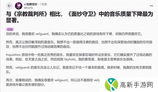 Reddit用户Wire74表示:“《龙腾世纪:审判》有一些确实非常优秀的音乐,我喜欢在探索区域时听,它们确实提升了过场动画的品质。而《影障守护者》的音乐则完全让人忘记,我甚至记不住一首基本的曲子。很多时候,我真的没有注意到音乐。”