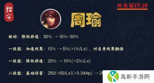 队友享受到的加速效果前期是削弱了,但自身是纯粹的加强,原来固定10%,现在是10%-20%,凭空多了10%的加速,这可能会让周瑜的灵活性得到质变。
