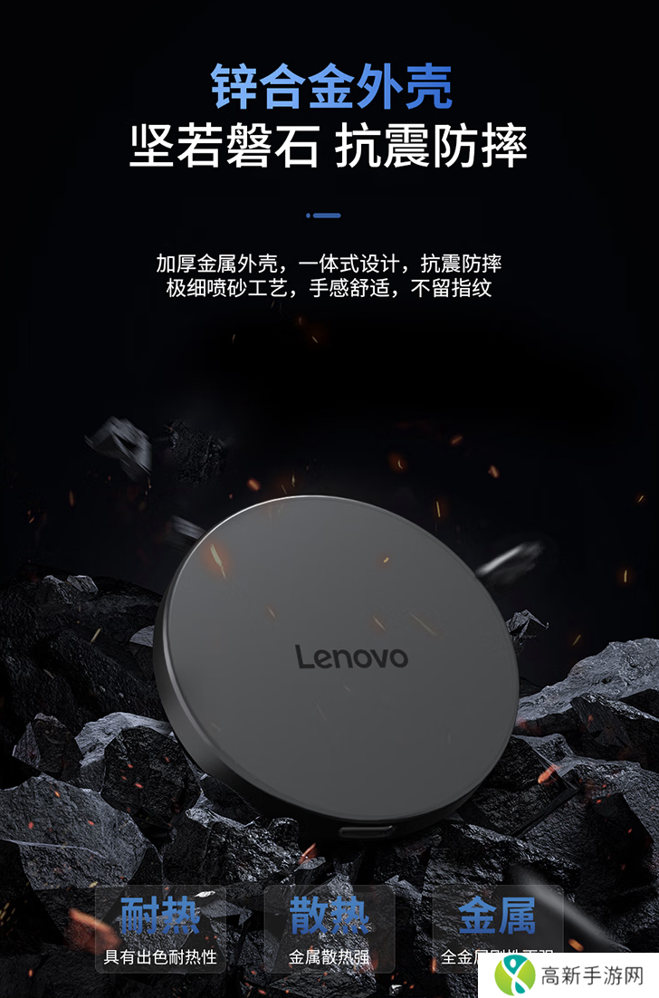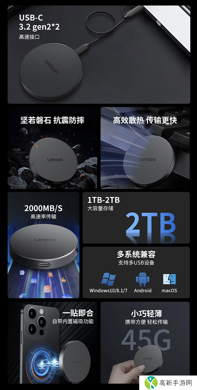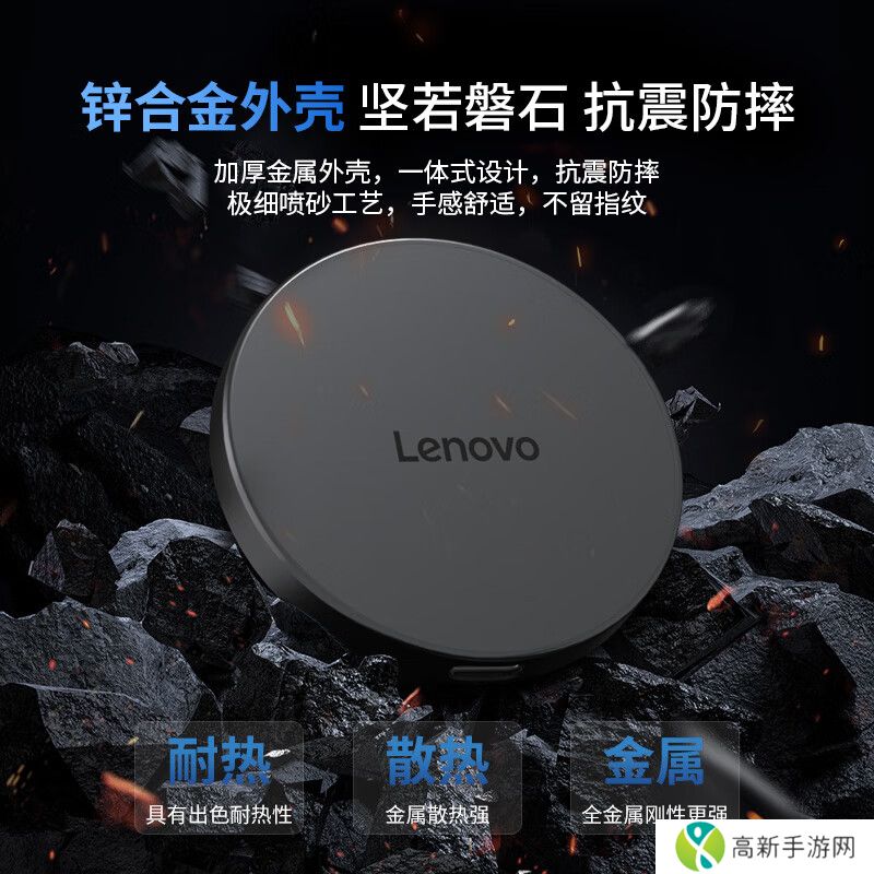 联想 Y910 磁吸移动固态硬盘使用圆形外观 + 锌合金外壳 + 哑光黑配色设计,重约 45g,内置磁吸功能。硬盘配备配 USB-C 3.2 Gen2*2接口,支持1800-2000 MB/s 读速、1700-1900MB/s 写速。