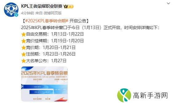 虎扑01月13日讯 春季转会期公告:今日开启自由交易期,1月27日公布大名单原文如下:【2025KPL春季转会期 开启公告】2025年KPL春季转会窗口于今日(1月13日)正式开启,时间安排详情如下: