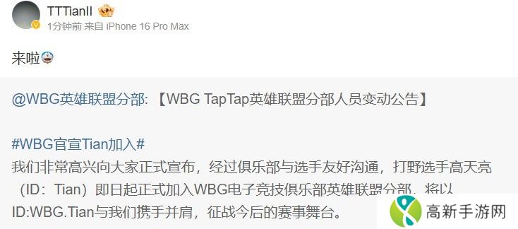 当前位置:首页>手游攻略> Tian转发WBG官宣加盟微博:来啦!