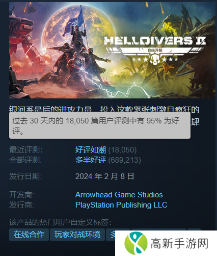 可在今年发布的诸多新游戏中,却有这样一朵奇葩。自上线以来,它就在“好评如潮”和“差评如潮”间反复横跳。巅峰时Steam好评率能冲上95%,低谷时又能日增差评10万条。靠着更新,开发商完全拿捏了玩家,而这款游戏就是由箭头工作室制作的《绝地潜兵2》。
