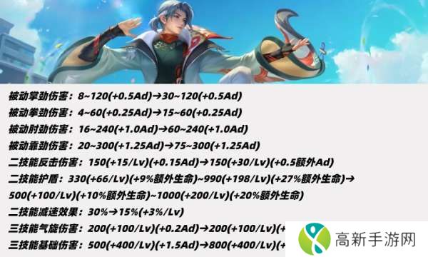 一二三技能上调基础伤害、AD加成改为额外AD加成,一/三技能护盾新增额外生命值加成、