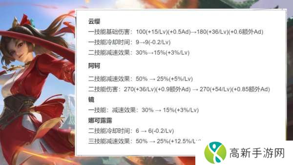 二技能减速从30%调整至15%-30%,一技能伤害上调基础数值、AD改为额外AD加成,满级一技能缩短1秒。