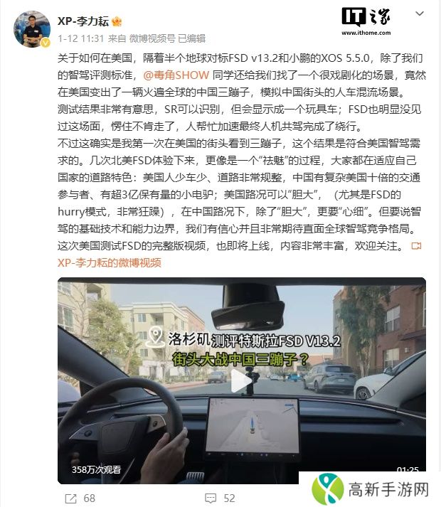 本站 1 月 14 日消息,近期小鹏汽车自动驾驶负责人李力耘在美国洛杉矶对特斯拉 FSD(Full Self-Driving)V13 2 版本进行了深度体验,并分享了其使用感受。李力耘称在洛杉矶测试期