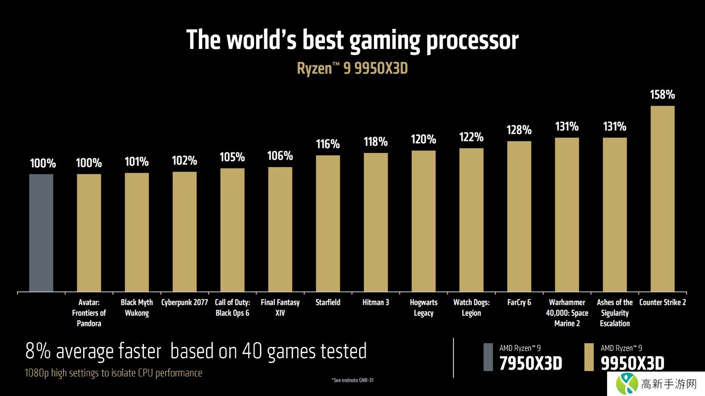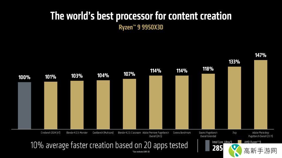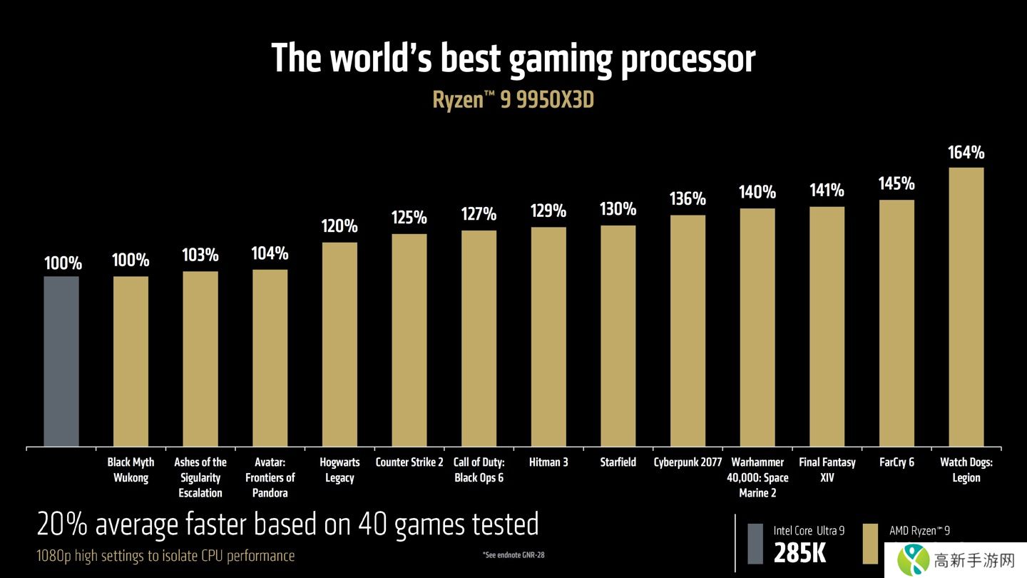 AMD 官方表示,通过 40 款热门游戏测试,相比较英特尔旗舰 Arrow Lake Core Ultra 9 285K,锐龙 9 9950X3D 的平均性能高 20%。