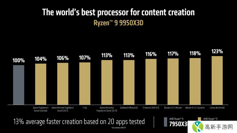 得益于 Zen 5 架构,Ryzen 9 9950X3D 在内容创作方面也表现出色,在 Corona、Blender、Cinebench 和 Adobe Photoshop 等应用中,性能平均提升 13%,最高可达 23%。