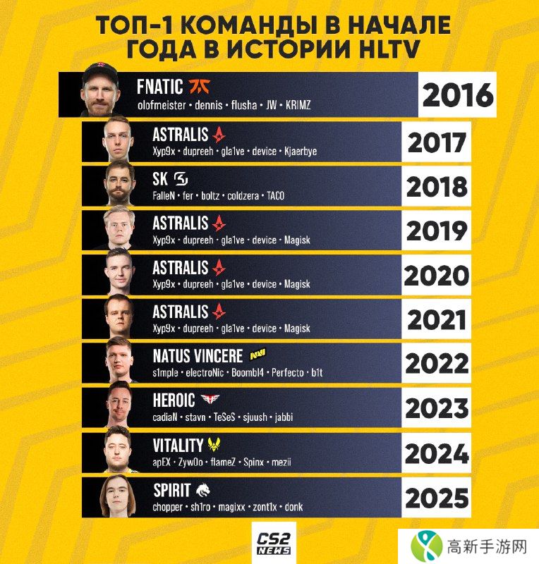 近日,有俄罗斯媒体统计了自2016年以来,以HLTV世界第一身份开启新的一年征程的队伍们。其中,Astralis在年初以头名身份开局的次数最多。而今年伊始,Spirit战队赶超G2登顶HLTV世界战队排行榜,进入2025年。
