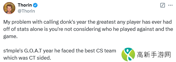 “仅凭数据就把donk刚出道的这一年称为史上最伟大的一年,我的矛盾点在于你没有考虑到他面对的对手和比赛难度。