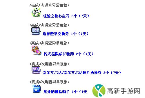2025年1月1日起至1月7日,玩家可接取[追寻]调查异常现象任务,和奥尔卡一起调查冒险岛的异常现象,消灭1000个等级范围内怪物,一天完成一次调查异常现象,即可获得对应礼物。
