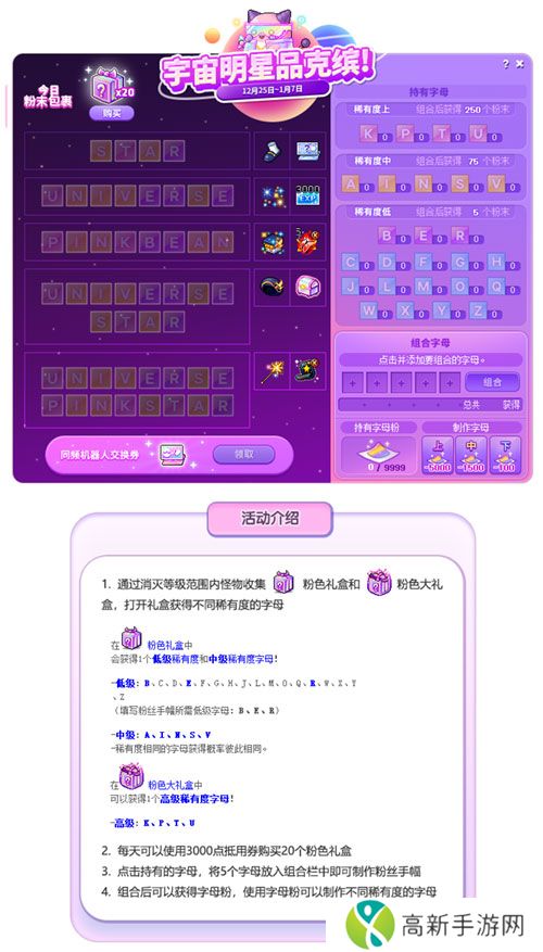 2024年12月25日起至2025年1月7日,接取[宇宙明星]宇宙明星品克缤登场任务,帮助品克缤成为宇宙明显,通过消灭等级范围内怪物收集粉色礼盒和粉色大礼盒,打开礼盒获得不同稀有度的字母,收集字母完成为宇宙明星品克缤加油的粉丝手幅时,就能获得品克缤的礼物!