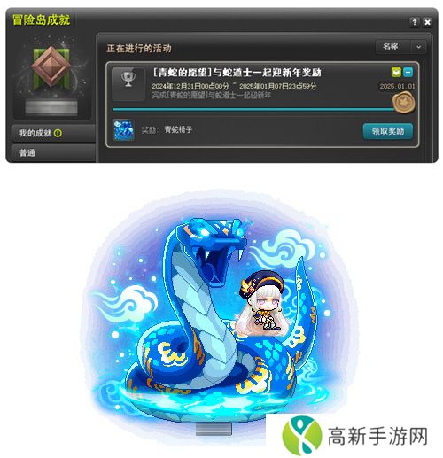 2024年12月31日至2025年1月1日,在主要村庄处找到NPC蛇道士,接取[青蛇的愿望]与蛇道士一起迎新年任务,听取新年祝福,即可在冒险岛成就中获得青蛇椅子奖励。