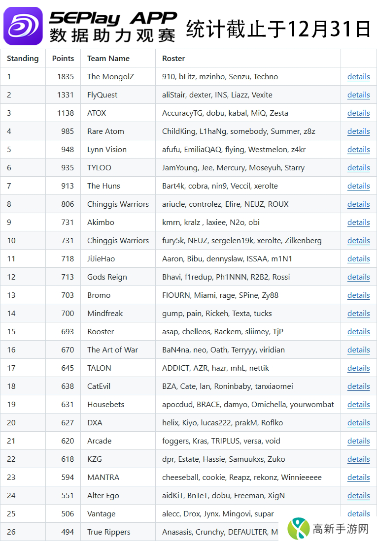 从第12名开始,榜单出现了些许变化。目前排名12的战队由上次的