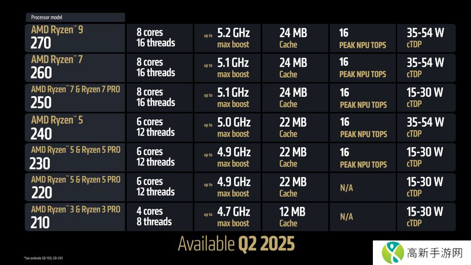 其中 Ryzen 9 270、Ryzen 7 260、Ryzen 7 250 都采用 8 核 16 线程设计、24MBL3 缓存,配备最高 16TOPS 的 AI 算力,可调整热设计功耗则分别为 15W-30W 与 35W-54W。
