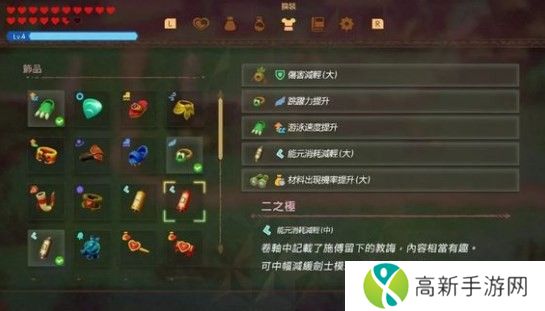 《塞尔达传说 智慧的再现》是塞尔达传说ip下的一部新作品,该作品以公主塞尔达为主角。二之极是游戏中的一种饰品,这个饰品的效果是能元消耗减轻(中)。