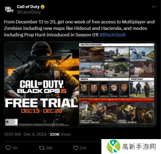 近日动视官方宣布,将从12月13日开启为期一周的免费试玩活动,至12月20日结束,将面向Xbox、PlayStation和PC平台上的玩家。