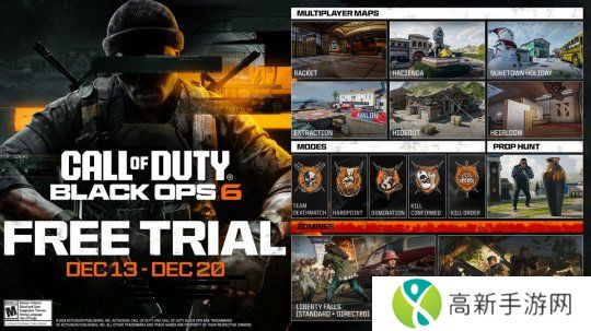 据动视官方分享的《使命召唤21:黑色行动6》7天免费试玩活动的宣传图中可以看到,该试玩版本将包含6张多人地图,多达5种的游戏模式,以及在第一赛季中推出的“PROP HUNT”模式。此外《使命召唤21:黑色行动6》的免费试玩版还将包含“Liberty Fall”僵尸模式和名为“Terminus”的僵尸地图。