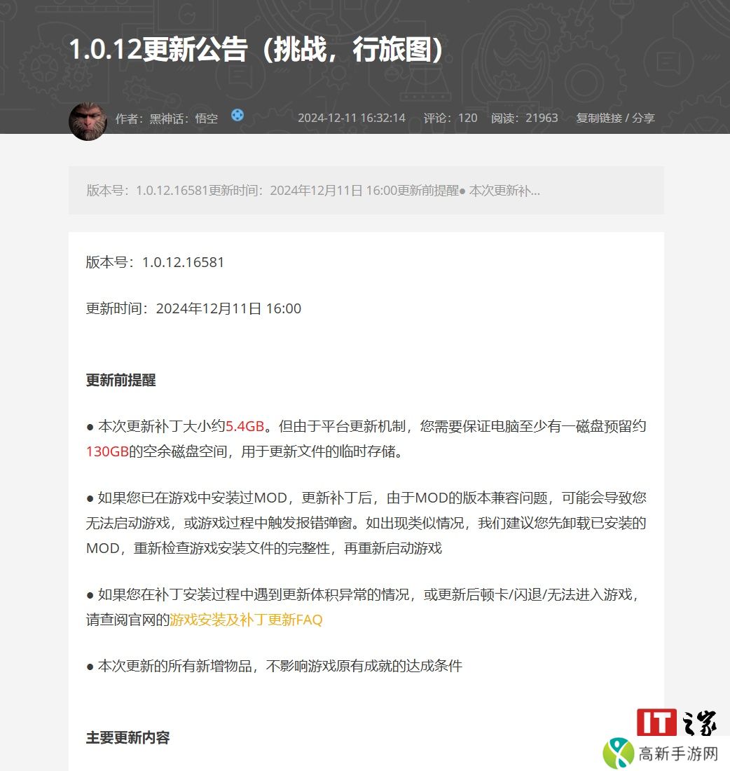 本站注意到,游戏《黑神话:悟空》官方今日在腾讯 WeGame 平台发布《1.0.12 更新公告(挑战,行旅图)》,介绍了新版本更新情况:本次更新补丁大小约 5.4GB,主要加入了新玩法“挑战”、新功能“行旅图”以及新披挂“彩金套装”等,详细更新内容可见此前报道。