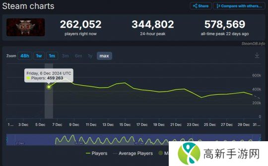在本月推出抢先体验版本的类暗黑刷子游戏《流放之路2》,根据SteamDB的统计数据,游戏推出的首日其Steam平台的在线峰值就接近46万,可谓是现象级作品。