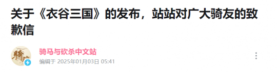 由于《衣谷三国》的翻车,作为国内最大《骑马与砍杀》玩家社区和Mod发布平台的骑砍中文站,也于今日发布了致歉声明,为自己没有承担起应有的职责向大家致歉。同时向广大玩家澄清,他们没有通过这个Mod的众筹,收取过一分钱。
