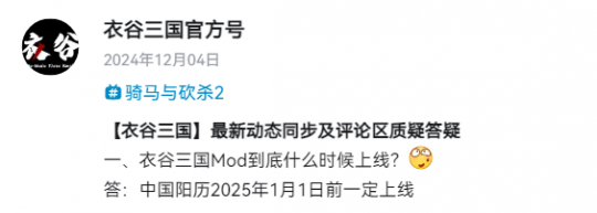事实上,早在衣谷作坊宣布Mod的正式发布日期时,《衣谷三国》就已经显露出了不够稳健的苗头。衣谷作坊原本承诺的是2024年以前“一定上线”,但临了却被推迟到了2025年1月1日。