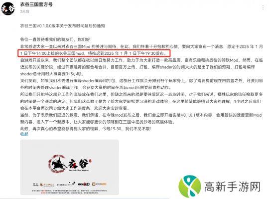 都说新的一年新的开始,玩家们也未多做计较。结果原定在1月1日下午14点准时发布的Mod,又被推迟到当天19点30分。官方给出的理由,则是因为Mod的打包、编译流程太长,超出了事先的预期。