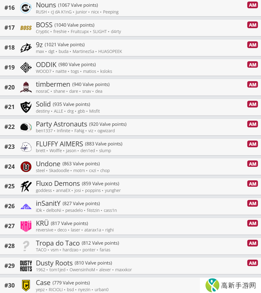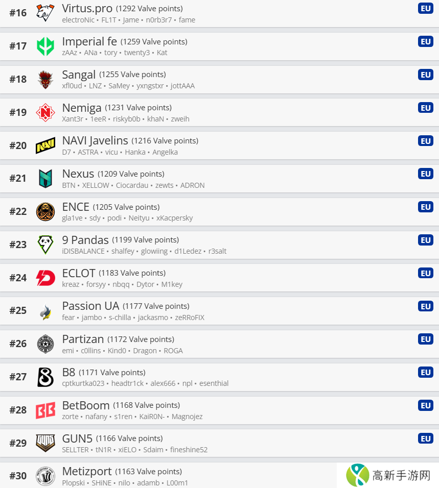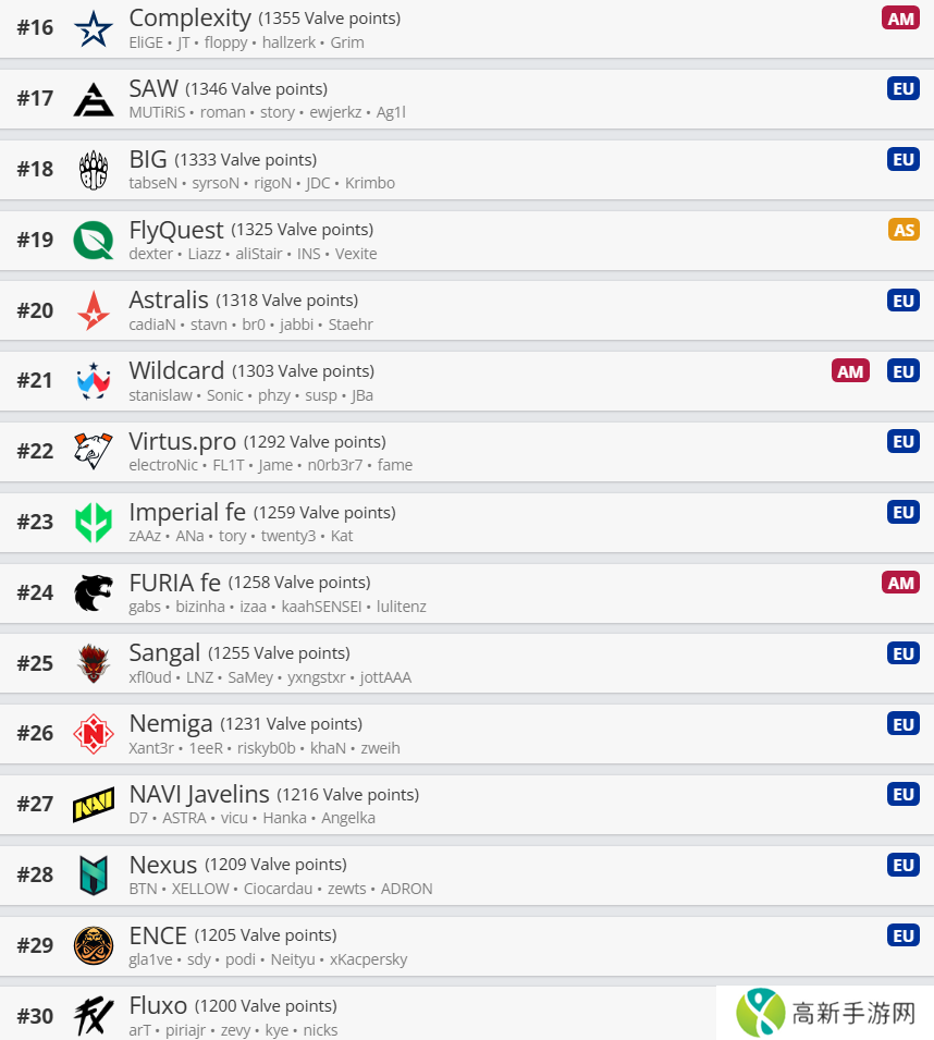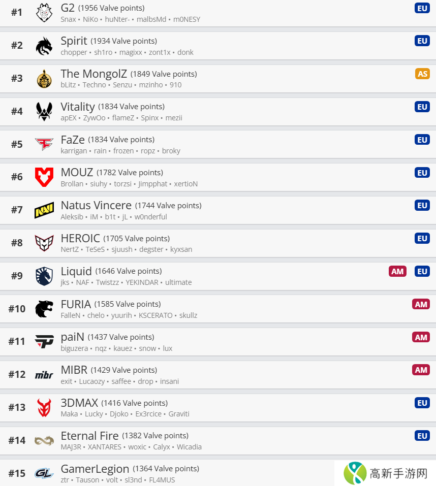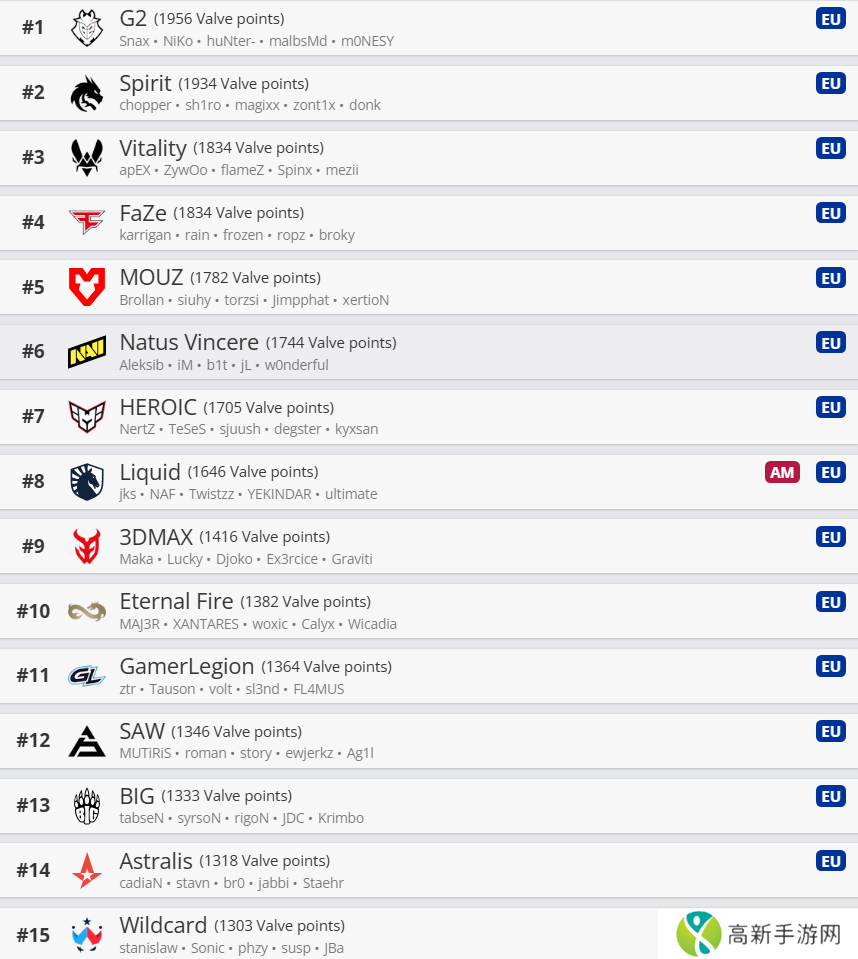 Natus Vincere战队因在上海Major未能进入淘汰赛,下滑至第7位。
