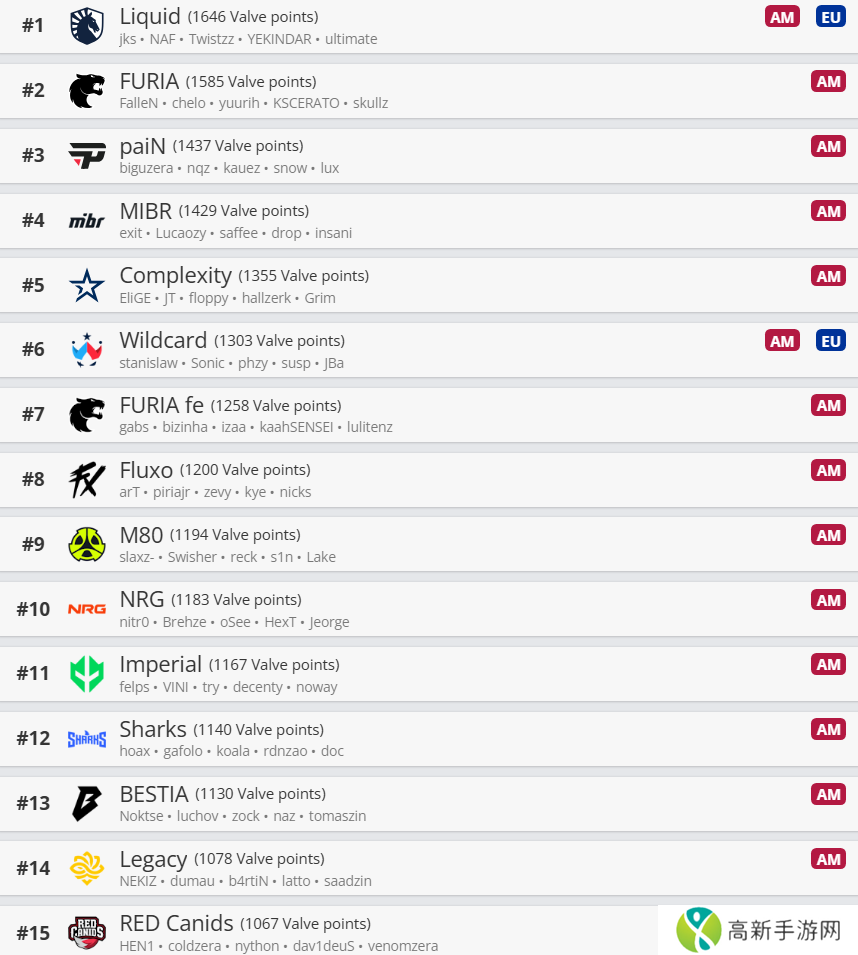 该排名将决定IEM 卡托维兹站、PGL克鲁日 - 纳波卡站以及EPL S21的参赛邀请归属。