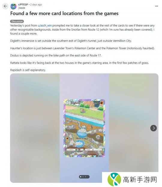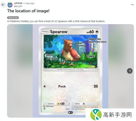 名为“asch_win?”的reddit用户,就明确指出了猎雀卡牌的插画取景位于《宝可梦 叶绿》玉虹市。而名为“jteede”的reddit用户发现了更多的对应,例如地鼠1星卡牌的位置就在枯叶市附加的山洞处;鬼斯通则在紫苑镇的宝可梦中心和宝可梦塔之间;嘟嘟则是在17号公路东侧的自行车道上。