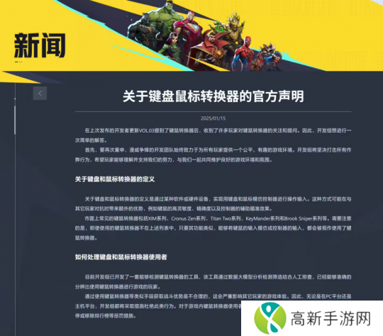 只是随着《漫威争锋》的人气日趋火爆,紧随其后的就是更多游戏内问题。不过,跟同类型的其他游戏更多是为**所困扰,《漫威争锋》最先针对的却是利用硬件外设的作弊手段。日前,《漫威争锋》官方就发布了关于键鼠转换器的声明。