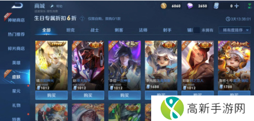 均为6折,但只可购买1张(如图中李元芳皮肤—飞鸢探春、鲁班七号皮肤—寅虎瑞焰均未列入6折皮肤特权)。