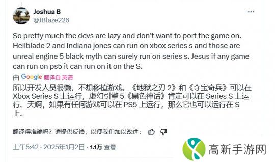 玩家:“所以大概率就是游戏科学太懒了,不想移植这个游戏。《地狱之刃2》和《夺宝奇兵》都能在Xbox Series S上游玩,《地狱之刃2》也是虚幻5游戏,因此《黑神话》肯定也可以。只要游戏能在PS5上玩,那么它一定也能在Xbox Series S上玩。”
