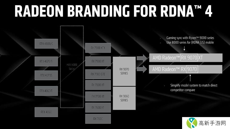 AMD 简化了命名方案,与 Ryzen 9000 系列 CPU 同步,此外后缀也对标英伟达产品,9070 对应英伟达的“70”系列,9060 对应英伟达的“60 系列”。XT 和非 XT 变体的细分与以前相同,XT 是高端产品,而非 XT 变体旨在成为更具成本效益的产品。