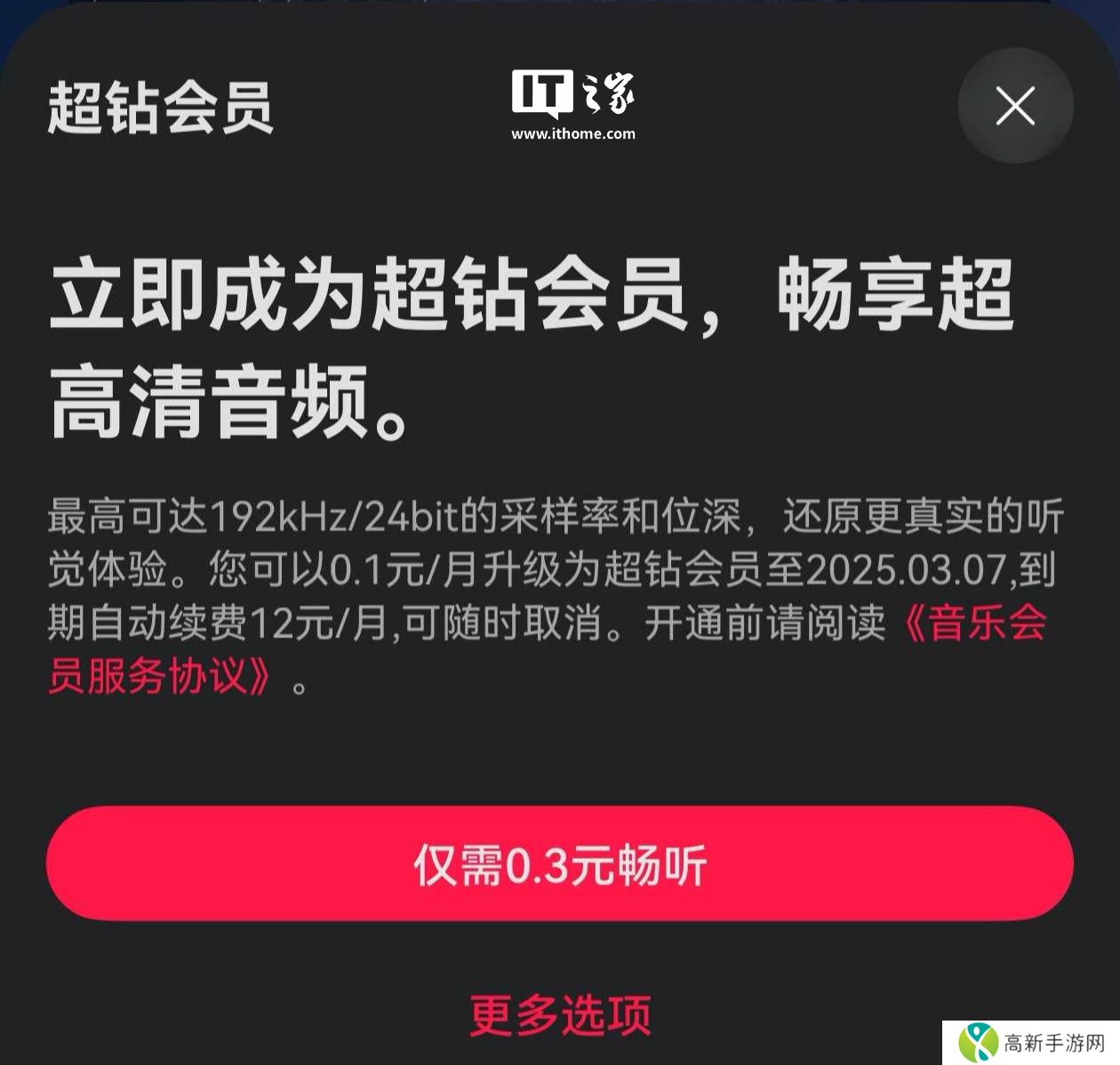 根据官方活动介绍,当前支持超级音乐会员以 0.1 元 / 月价格升级至“超钻会员”,另外该权益连续包月价格为 12 元 / 月,单月 40 元。