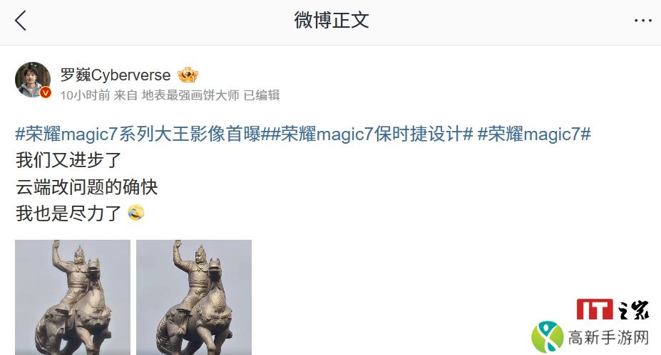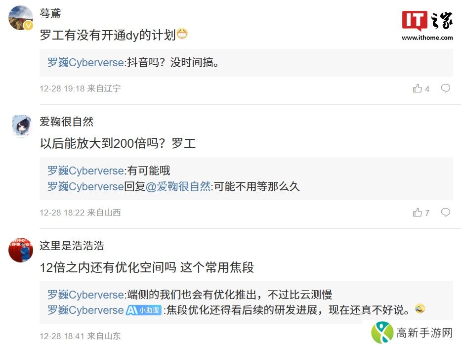 罗巍还在评论区中回复了部分网友的问题:针对荣耀手机以后是否会支持放大至 200 倍,他表示“有可能哦”;针对 12 倍以内长焦的后续优化计划,他称“端侧的我们也会有优化推出,不过比云测慢”。