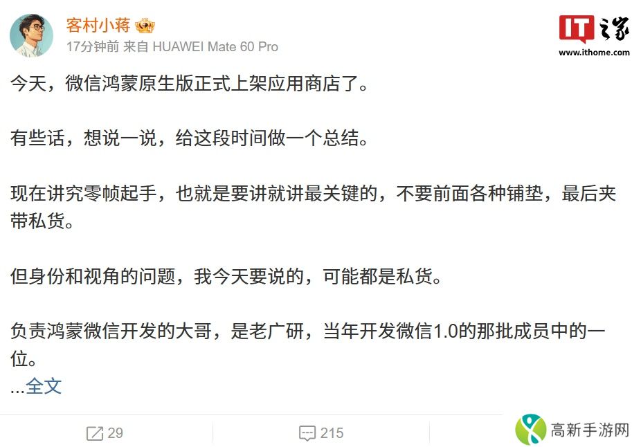 腾讯 WXG(微信事业群)员工 @客村小蒋 今日发布长文总结了微信纯血鸿蒙版 App 上架历程,本站附原文如下: