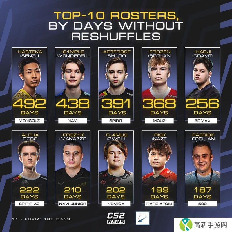 随着BLAST 赏金赛对阵队伍的确定,休赛期也即将迎来结束,各支队伍都进行了大大小小的变阵。然而也有许多队伍并未对阵容进行改动,接下来我们盘点十支长期未变阵的队伍: