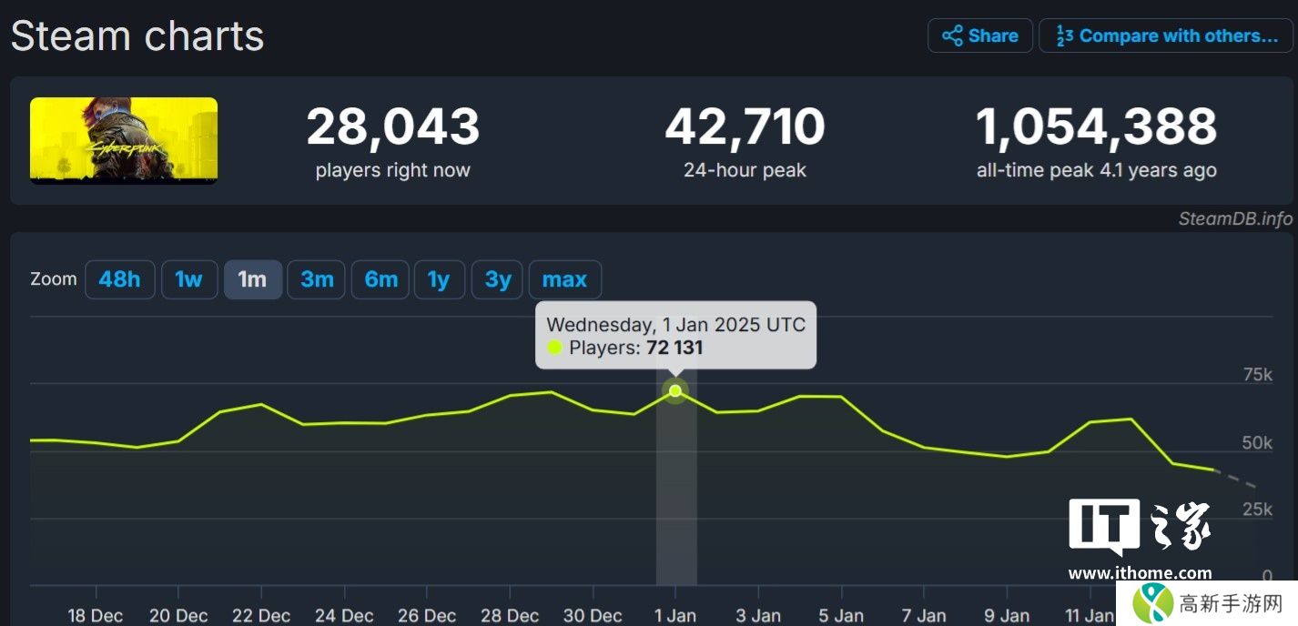 正因如此,即使在 2025 年,《赛博朋克 2077》的玩家基数依然强劲。根据 Steam 平台的数据显示,2025 年 1 月 1 日,该游戏的在线玩家数量突破了 7.2 万人,并在一段时间内保持了平均 7 万人的水平。尽管随后略微下降至 5 万人,但这一数据依然相当不错。