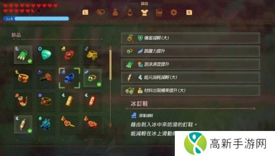 《塞尔达传说 智慧的再现》是塞尔达传说ip下的一部新作品,该作品以公主塞尔达为主角。冰钉鞋是游戏中的一种饰品,这个饰品的效果是滑落减轻。