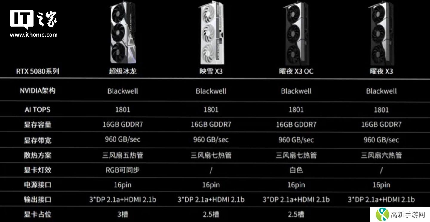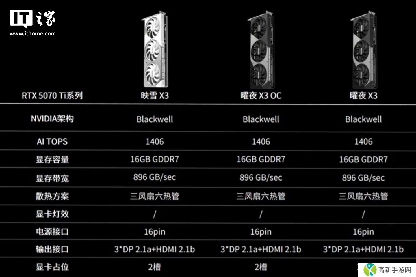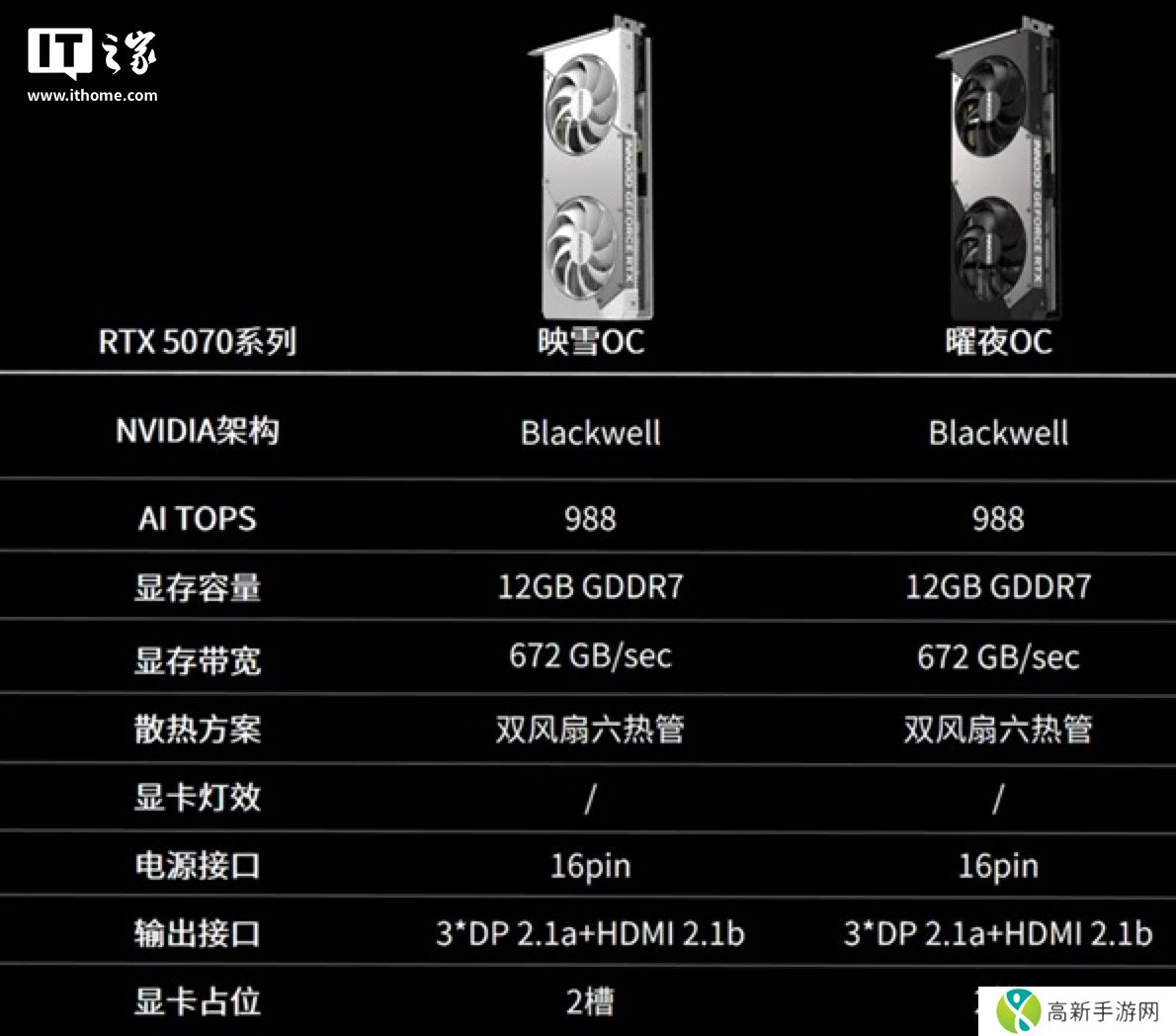 对于 RTX 5070 Ti,映众推出曜夜和映雪系列两款双槽厚度的产品。而在 5070 方面,除了曜夜 X3 OC 为三风扇,映雪、曜夜 OC 以及曜夜均为双风扇设计。