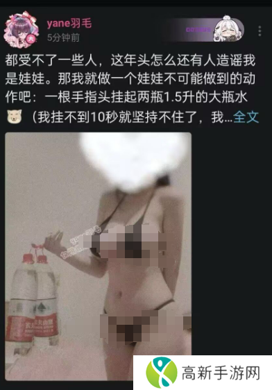 后续在网上,「yane羽毛」又公布了一张穿着清凉,用手指钩起两瓶矿泉水(农夫山泉打钱)的照片,试图证明自己是真人。奈何网友们人均“列文虎克”,当怀疑的种子已经种下,接下来玩“找茬”游戏就相当简单了。