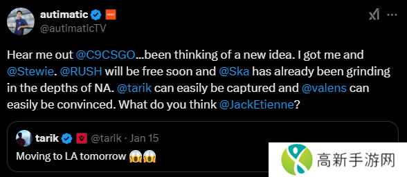 “听我说,@Cloud9......我有一个好点子:目前我这里有我跟Stewie2K,而RUSH也马上要恢复自由身了,Skadoodle也在北美摸爬滚打许久,tarik也很容易拉入伙,valens也很容易被说服,你怎么看?@JackEtienne(Cloud9俱乐部老板)”