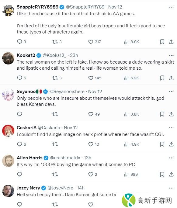 评论区有人表示:“我喜欢她们,因为她们就是游戏里的新鲜空气。我已厌倦那些丑陋、让人难受的女强人设定。”“我喜欢她们,韩国美女多!”“游戏女性应该是美丽而坚强的,而不是那种丑陋女性。”“她们太美了,天佑韩国。”“她看起来很漂亮!”