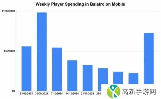 由LocalThunk开发的Roguelike卡牌游戏《小丑牌》在9月份登陆了移动端iOS和安卓,根据AppMagic的数据,该作在首周就赚取了超100万美元,随后游戏的收入逐周下滑,但在11月18日
